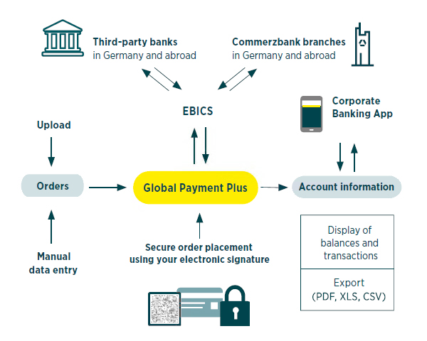 You can integrate all your accounts – even accounts held at third-party banks – into Global Payment Plus, provided that these banks use the EBICS standard.